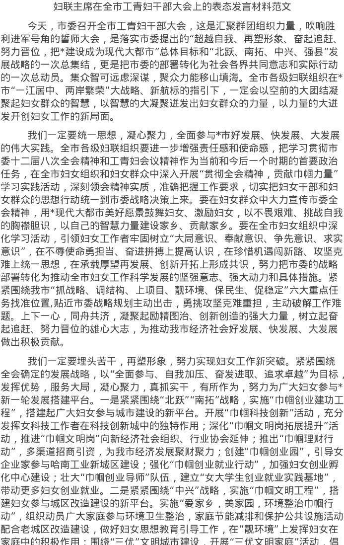 20220426妇联主席在全市工青妇干部大会上的表态发言材料范文