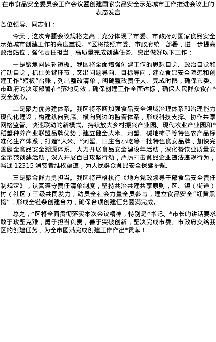 20220625在市食品安全委员会工作会议暨创建国家食品安全示范城市工作推进会议上的表态发言