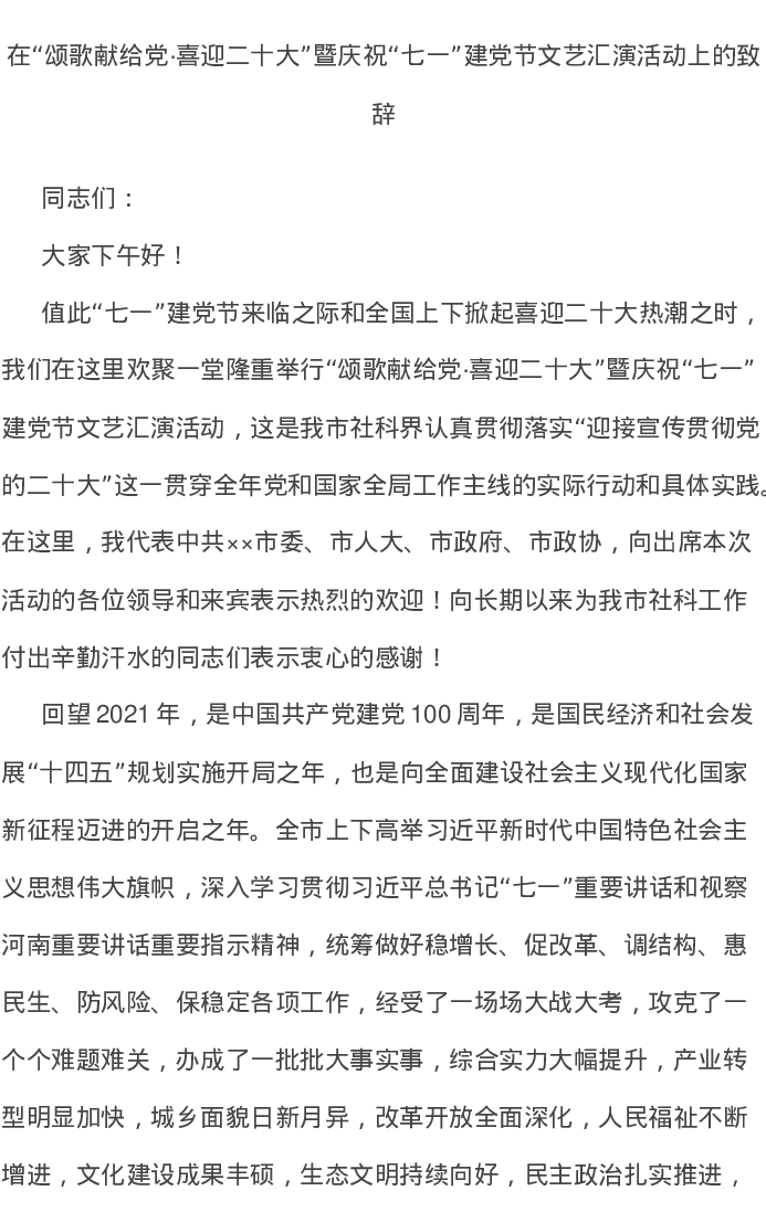20220627在“颂歌献给党·喜迎二十大”暨庆祝“七一”建党节文艺汇演活动上的致辞