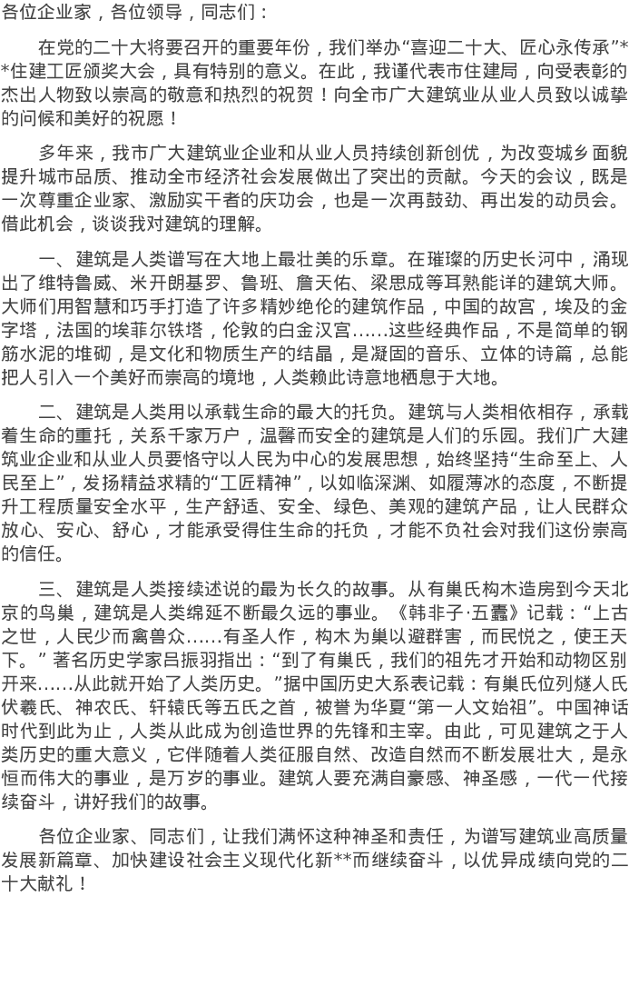 20220628“喜迎二十大 匠心永传承”——在全市住建工匠颁奖大会上的致辞