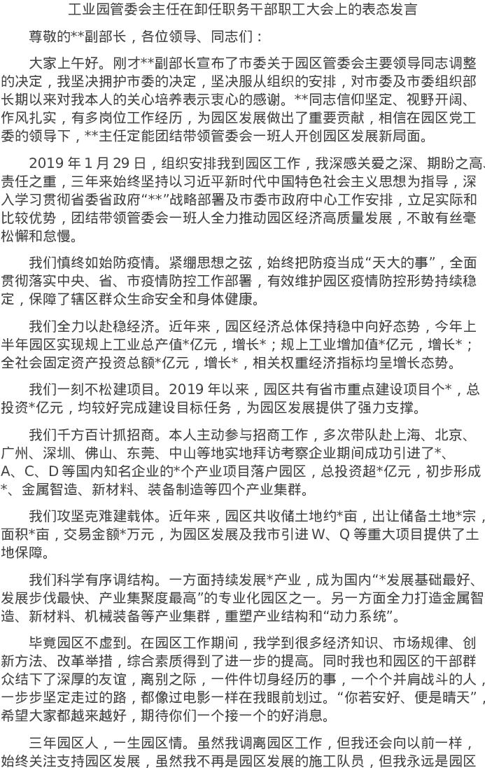 20220723工业园管委会主任在卸任职务干部职工大会上的表态发言
