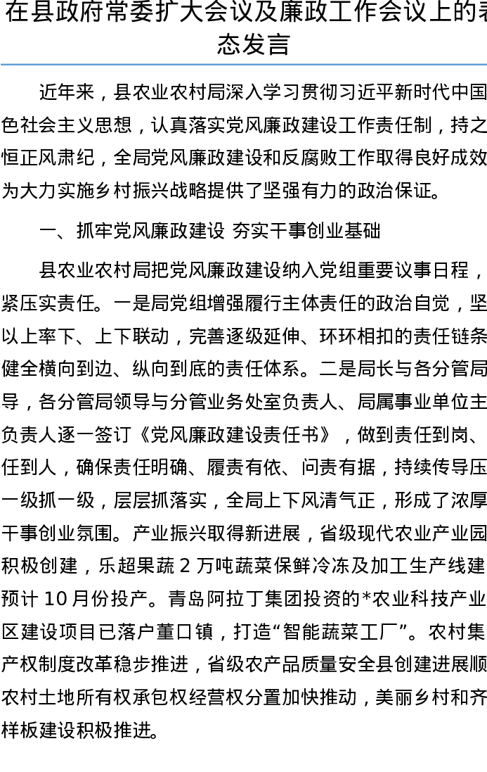 20220805在县政府常委扩大会议及廉政工作会议上的表态发言