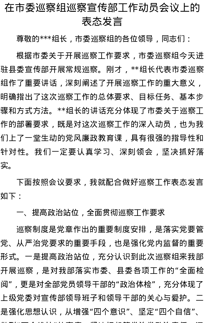 20220811在市委巡察组巡察宣传部工作动员会议上的表态发言
