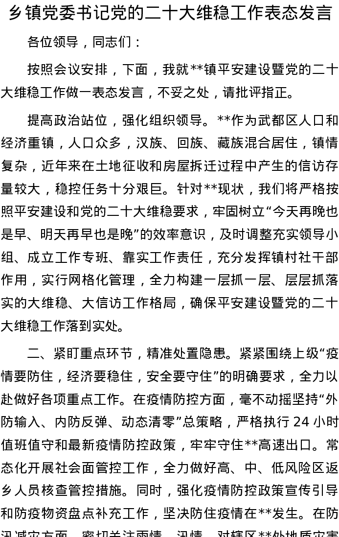 20220816乡镇党委书记党的二十大维稳工作表态发言