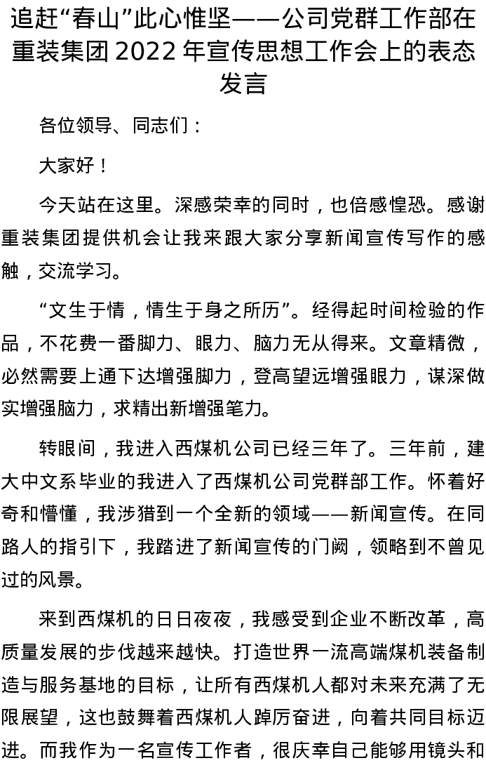 20220821追赶“春山” 此心惟坚——公司党群工作部在重装集团2022年宣传思想工作会上的表态发言
