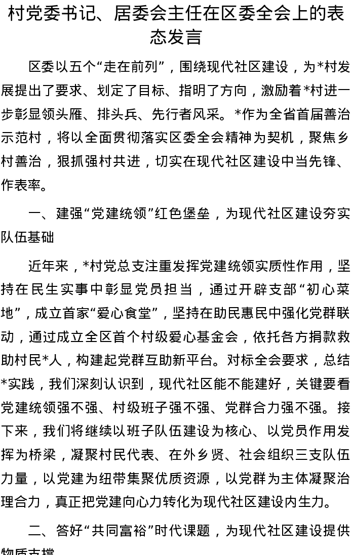 20220823村党委书记、居委会主任在区委全会上的表态发言