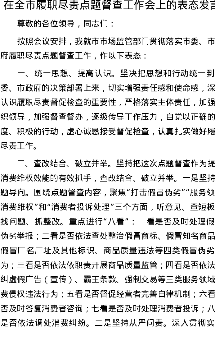 20220828在全市履职尽责点题督查工作会上的表态发言