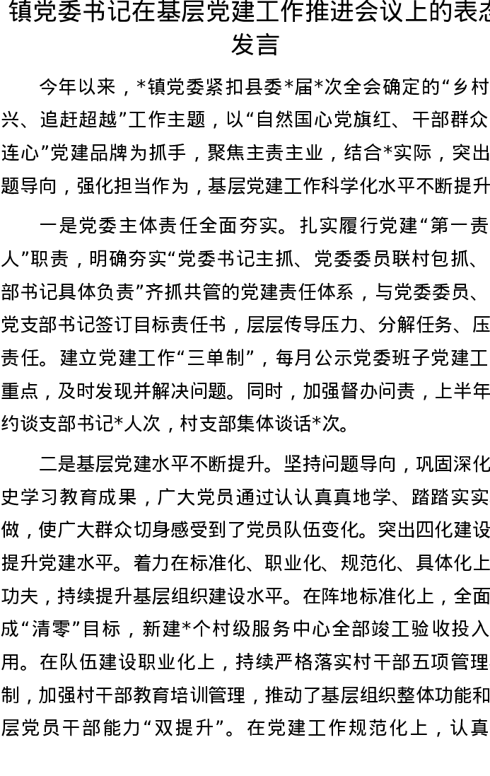 20220828镇党委书记在基层党建工作推进会议上的表态发言