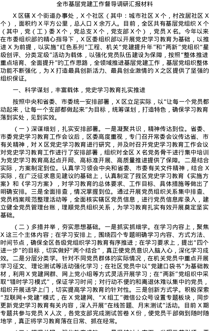 20220109全市基层党建工作督导调研汇报材料