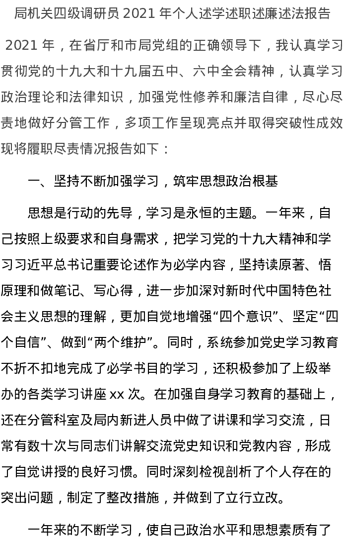 20220115局机关四级调研员2021年个人述学述职述廉述法报告
