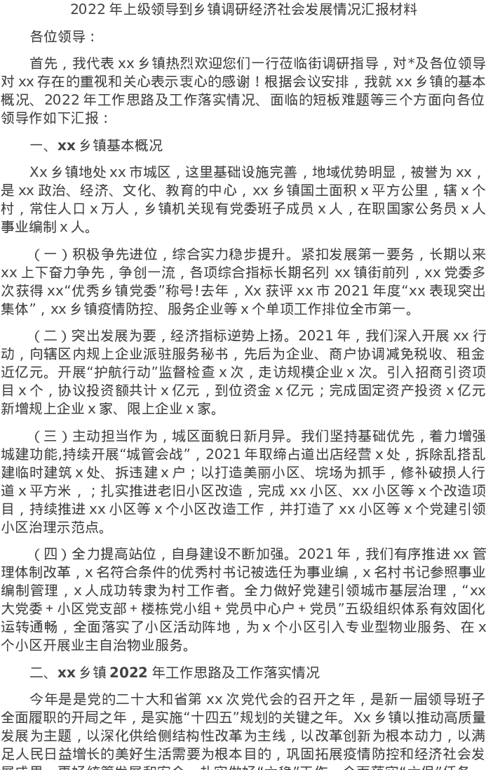 20220620-2022年上级领导到乡镇调研经济社会发展情况汇报材料