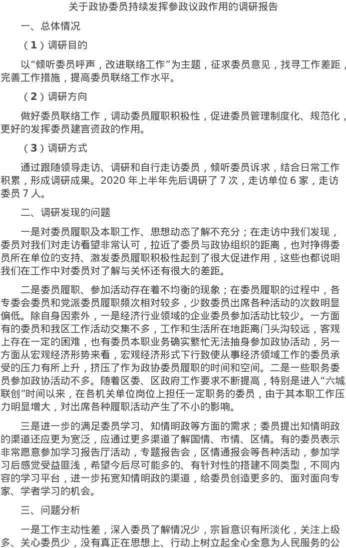 20220701关于政协委员持续发挥参政议政作用的调研报告
