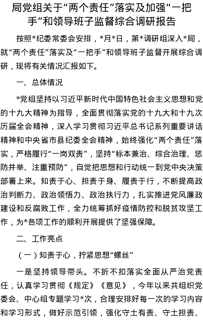 20220907局党组关于“两个责任”落实及加强“一把手”和领导班子监督综合调研报告