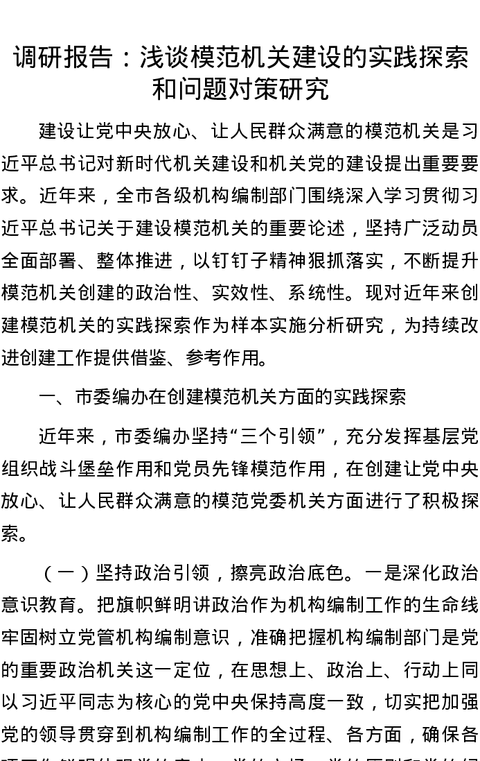 20220913调研报告:浅谈模范机关建设的实践探索和问题对策研究