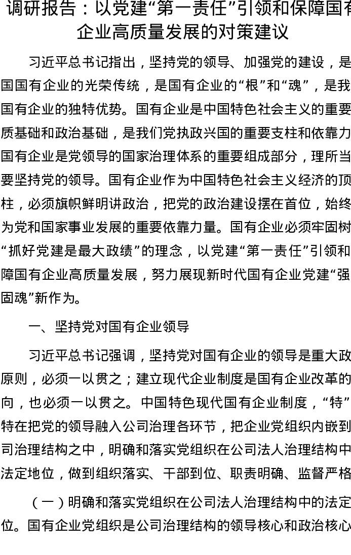 20220915调研报告:以党建“第一责任”引领和保障国有企业高质量发展的对策建议