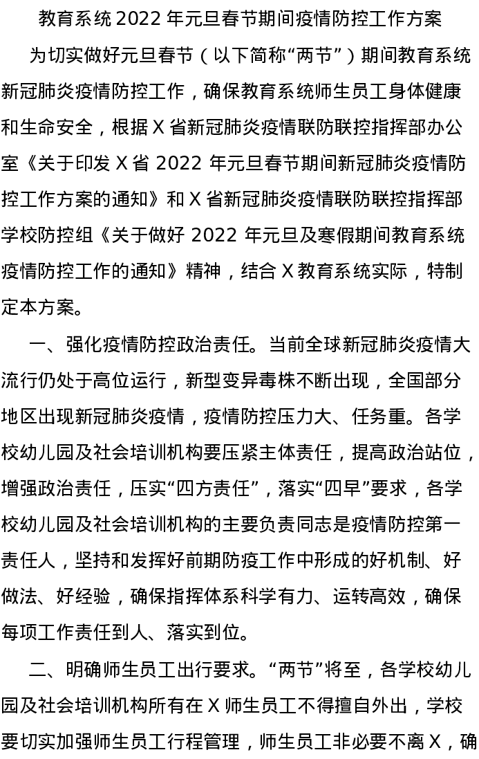 20220107教育系统2022年元旦春节期间疫情防控工作方案