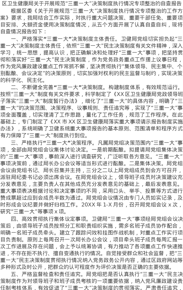 20220108区卫生健康局关于开展规范“三重一大”决策制度执行情况专项整治的自查报告