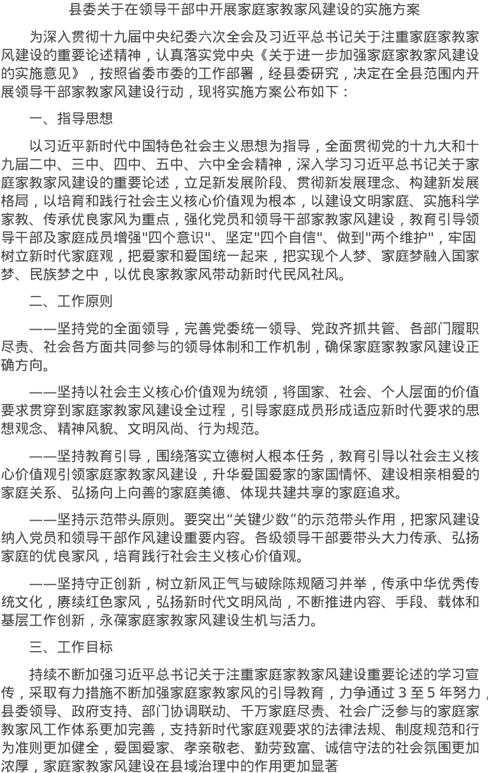 20220220县委关于在领导干部中开展家庭家教家风建设的实施方案