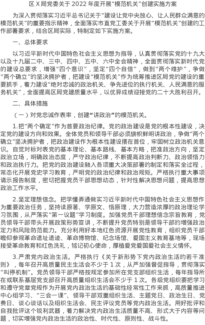20220225区X局党委关于2022年度开展“模范机关”创建实施方案