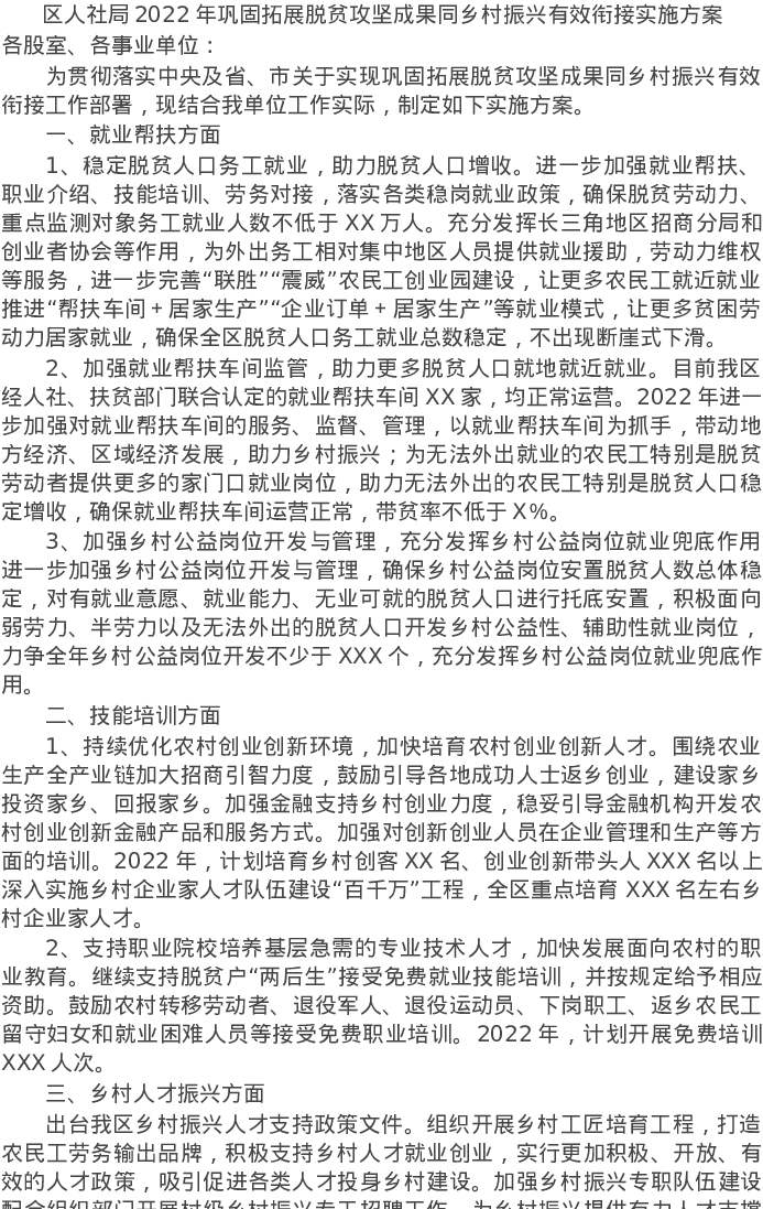 20220402区人社局2022年巩固拓展脱贫攻坚成果同乡村振兴有效衔接实施方案
