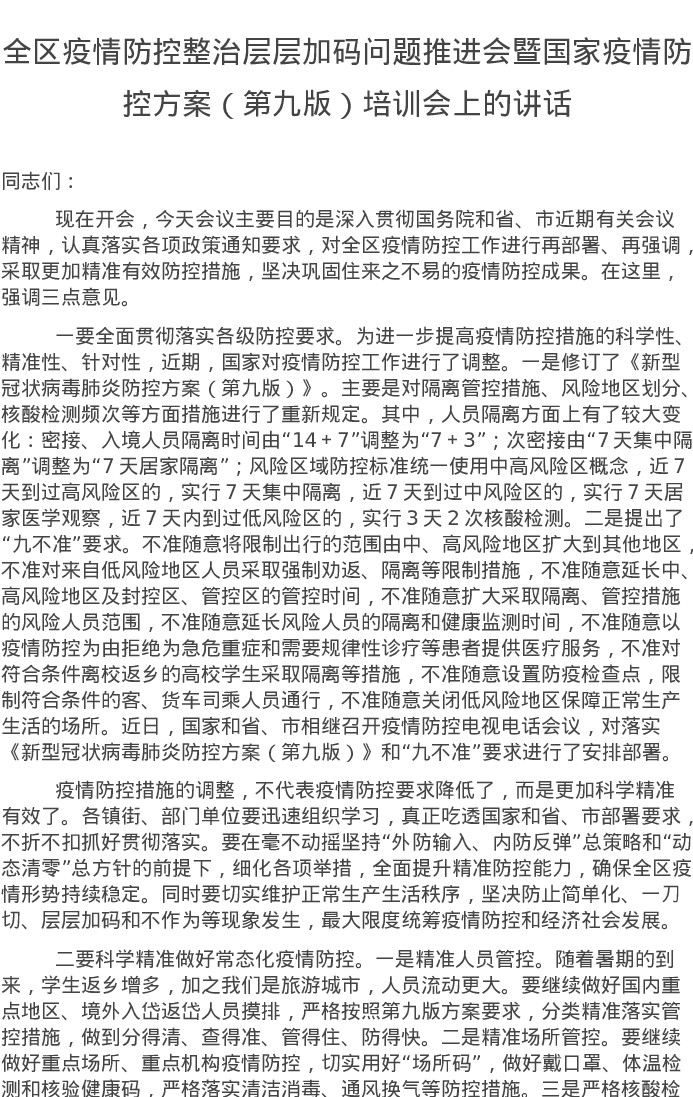 20220801全区疫情防控整治层层加码问题推进会暨国家疫情防控方案(第九版)培训会上的讲话