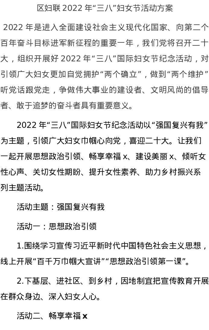 方案:区妇联2022年“三八”妇女节活动方案