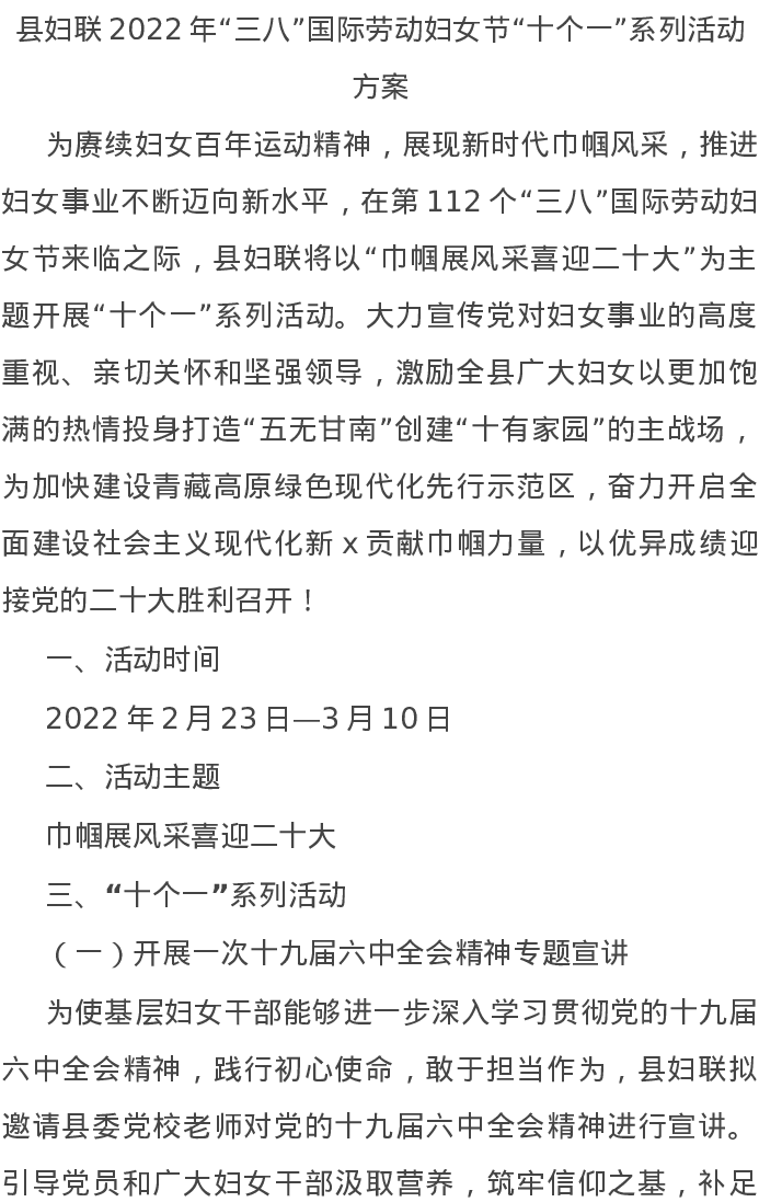 方案:县妇联2022年“三八”国际劳动妇女节“十个一”系列活动方案