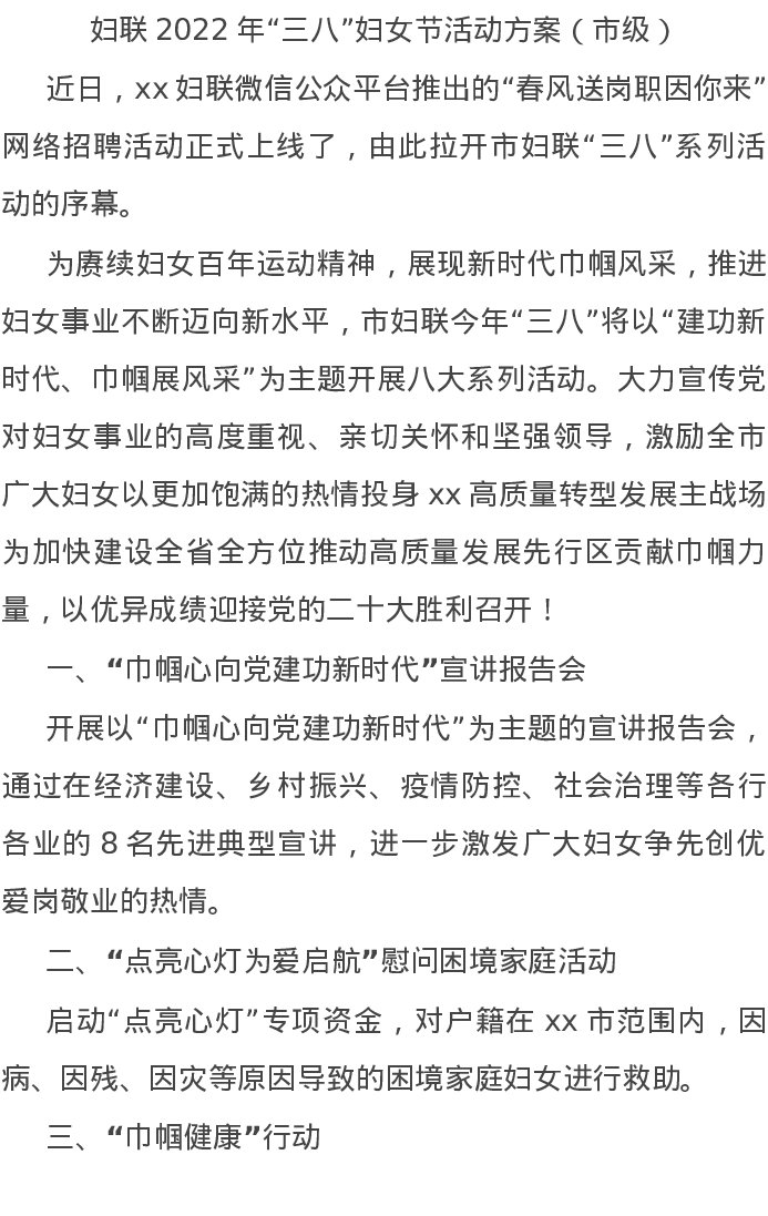 方案:妇联2022年“三八”妇女节活动方案(市级)