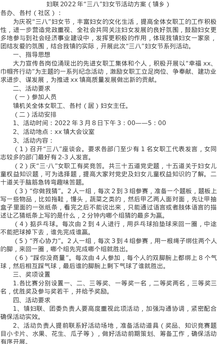 方案:妇联2022年“三八”妇女节活动方案(镇乡)
