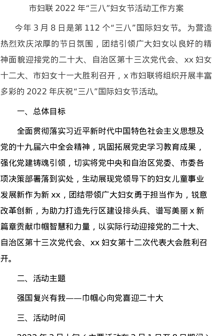 方案:市妇联2022年“三八”妇女节活动工作方案
