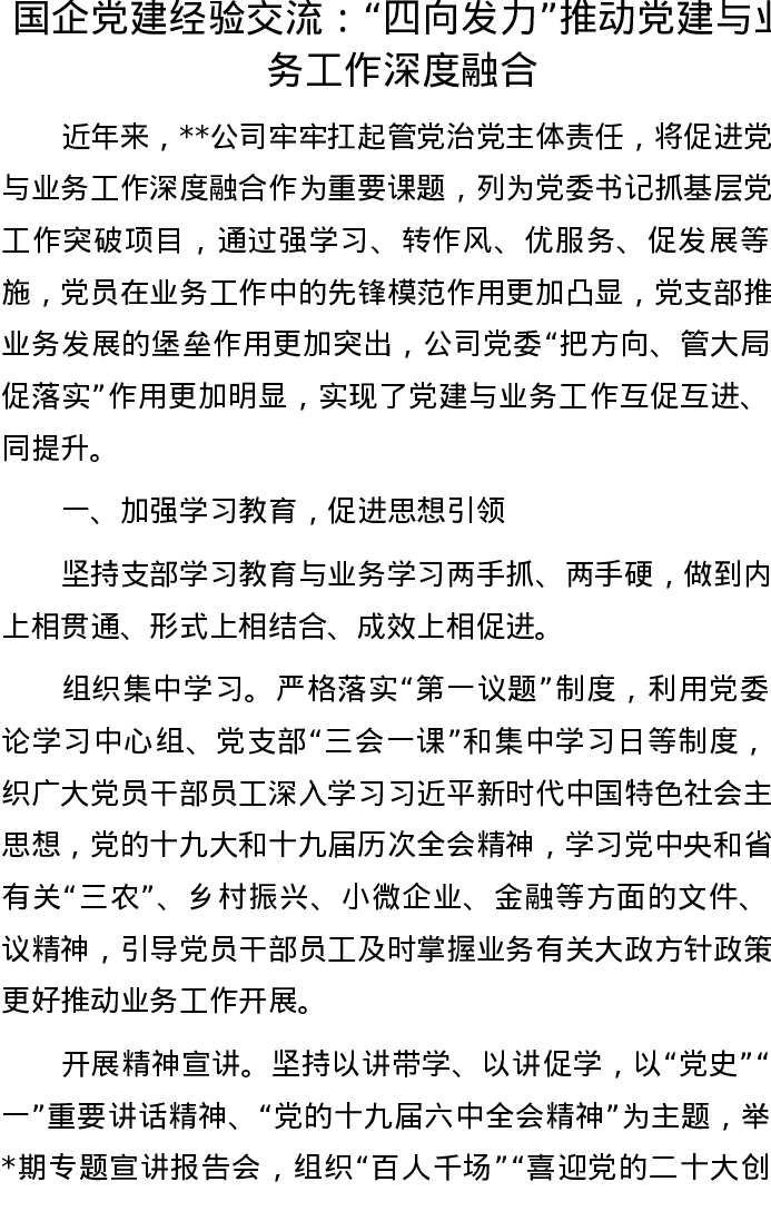 20220930国企党建经验交流:“四向发力”推动党建与业务工作深度融合