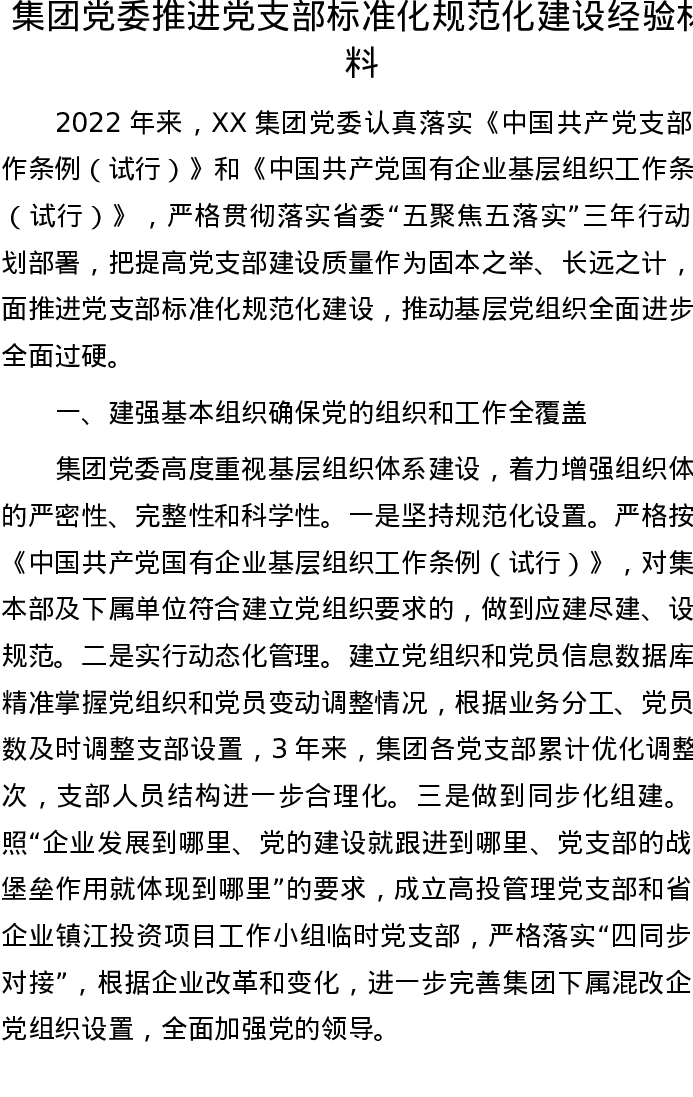 20221005集团党委推进党支部标准化规范化建设经验材料