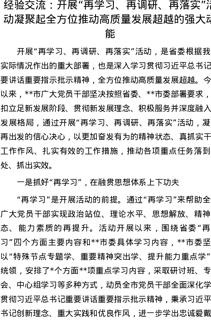 20221006经验交流:开展“再学习、再调研、再落实”活动 凝聚起全方位推动高质量发展超越的强大动能