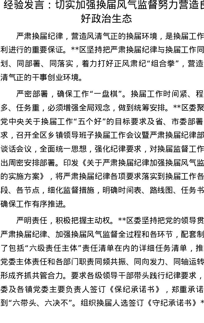 20221006经验发言:切实加强换届风气监督 努力营造良好政治生态