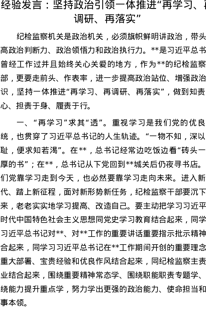 20221006经验发言:坚持政治引领 一体推进“再学习、再调研、再落实”