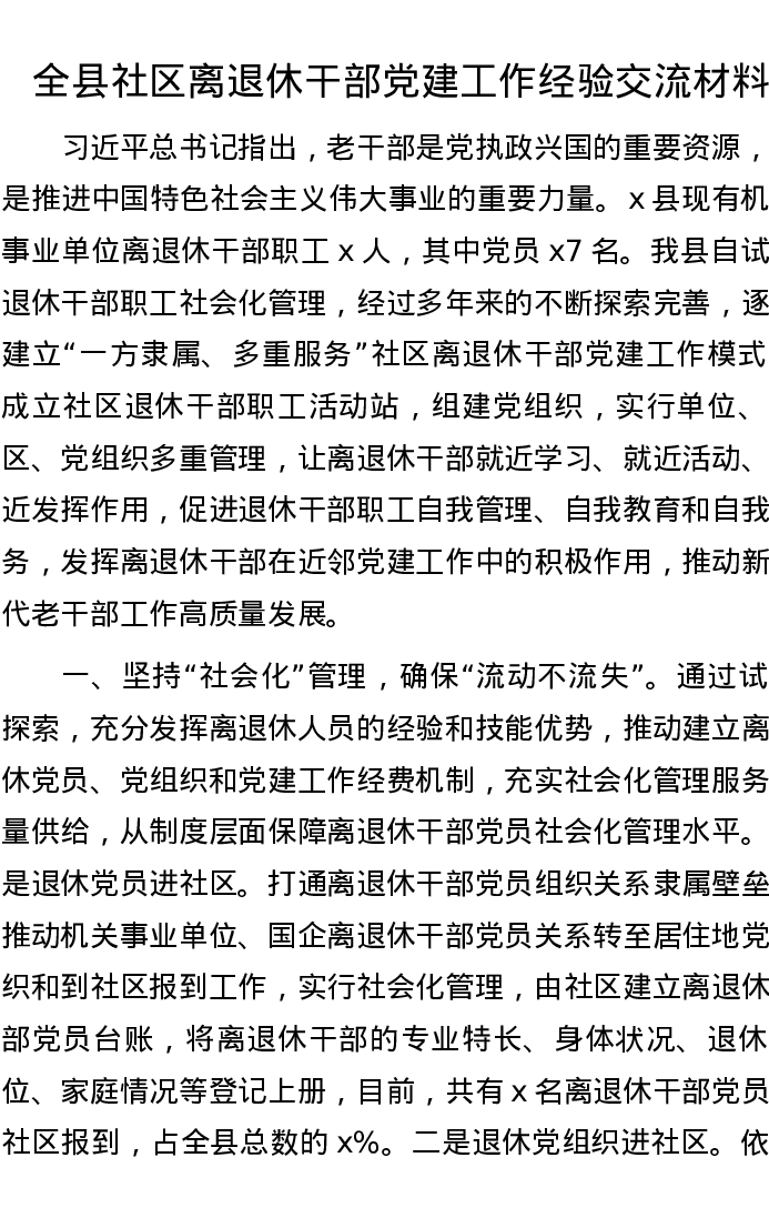 20221010全县社区离退休干部党建工作经验交流材料