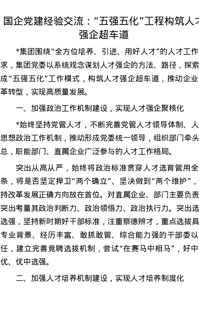 20221010国企党建经验交流:“五强五化”工程构筑人才强企超车道