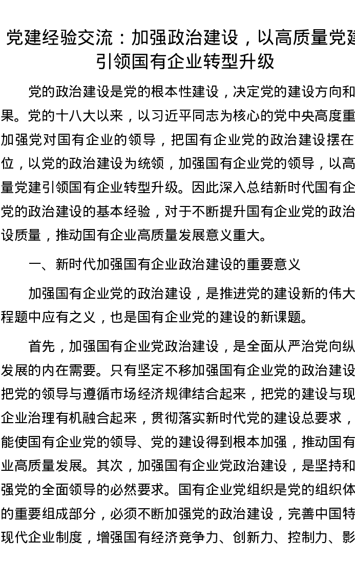 20221011党建经验交流:加强政治建设,以高质量党建引领国有企业转型升级