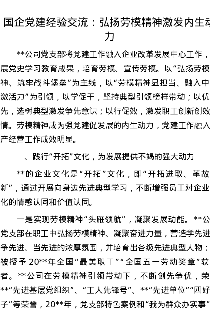 20221012国企党建经验交流:弘扬劳模精神 激发内生动力