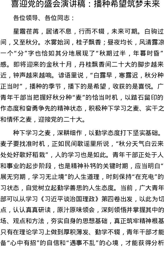 20220927喜迎党的盛会演讲稿:播种希望 筑梦未来