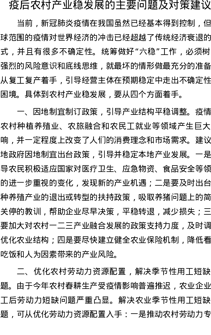 20221001疫后农村产业稳发展的主要问题及对策建议