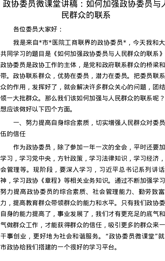 20221007政协委员微课堂讲稿:如何加强政协委员与人民群众的联系