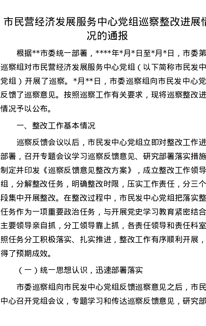 20221013市民营经济发展服务中心党组巡察整改进展情况的通报