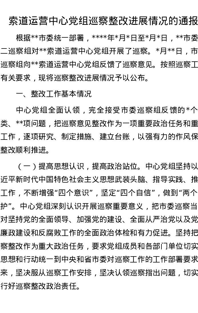 20221013索道运营中心党组巡察整改进展情况的通报