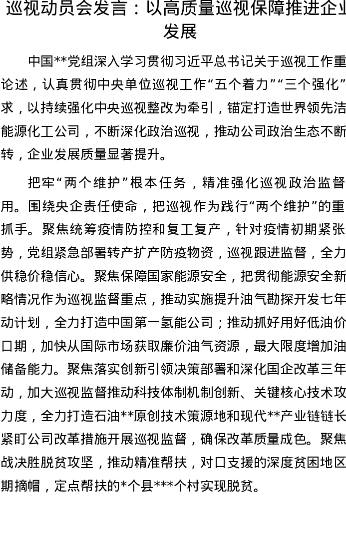 20221006巡视动员会发言:以高质量巡视保障推进企业发展