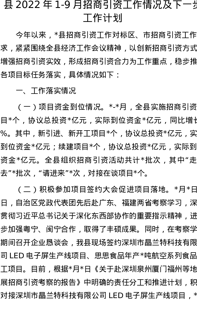20221006县2022年1-9月招商引资工作情况及下一步工作计划