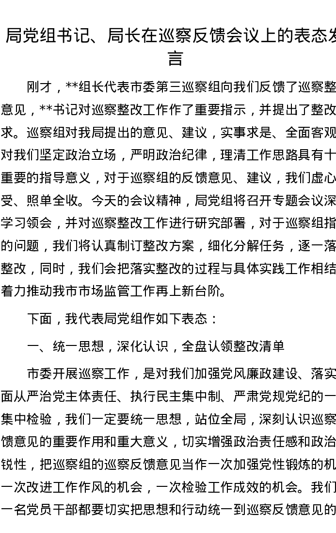 20220928局党组书记、局长在巡察反馈会议上的表态发言