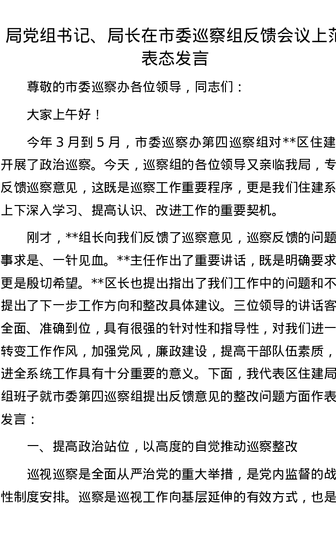 20220928局党组书记、局长在市委巡察组反馈会议上范表态发言
