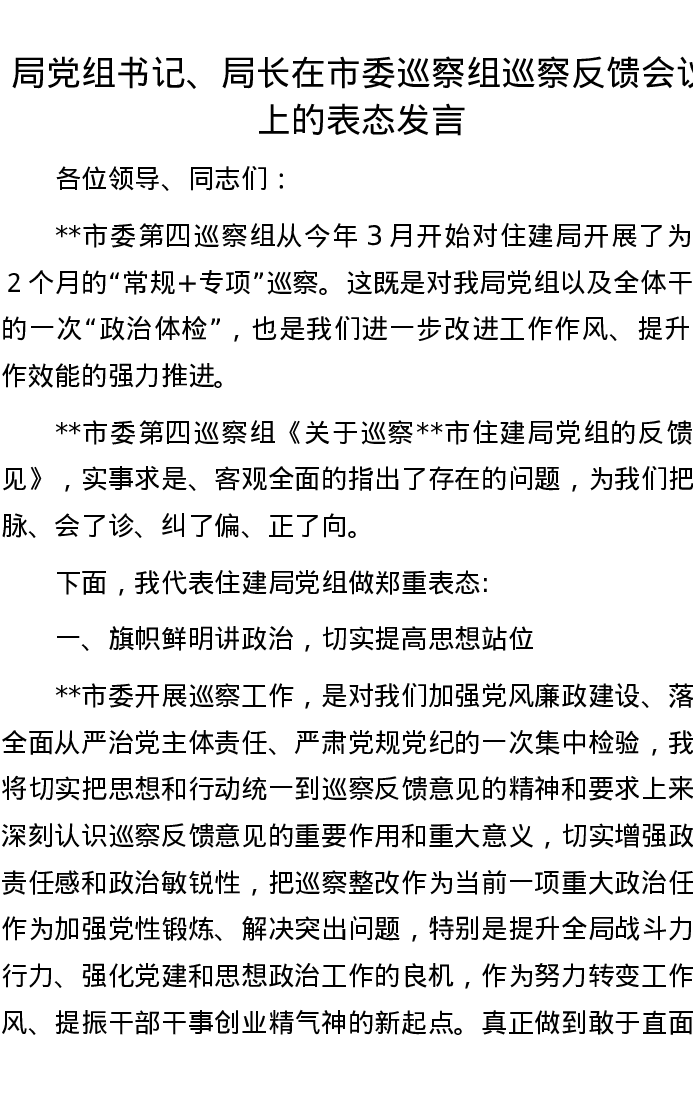 20220928局党组书记、局长在市委巡察组巡察反馈会议上的表态发言