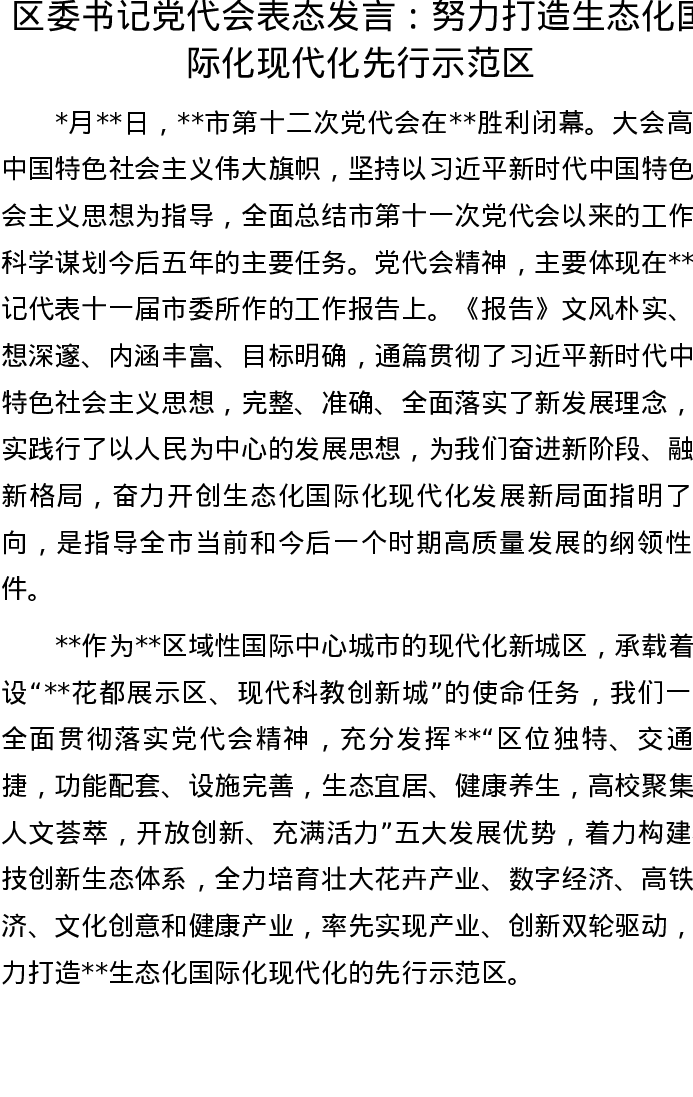 20221002区委书记党代会表态发言:努力打造生态化国际化现代化先行示范区